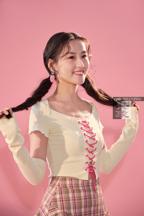 图片标题:     粉色背景下的一位年轻快乐女孩