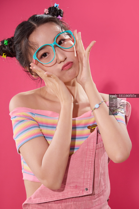 图片标题: 粉色背景下戴眼镜的年轻女孩