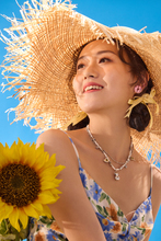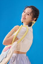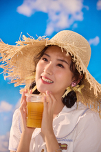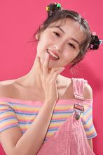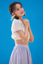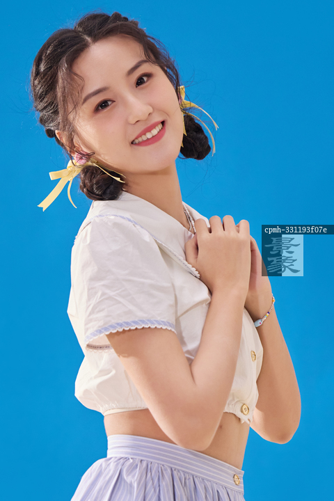 图片标题: 蓝色背景下的一位快乐的青年女人