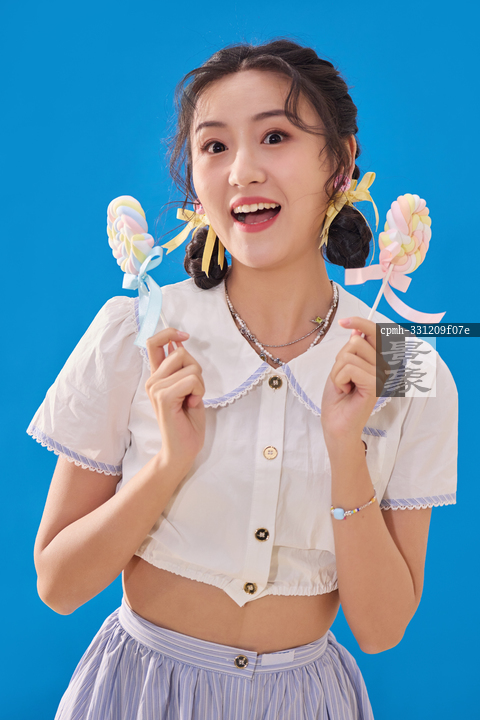 图片标题:     蓝色背景下的拿着棒棒糖的快乐女人