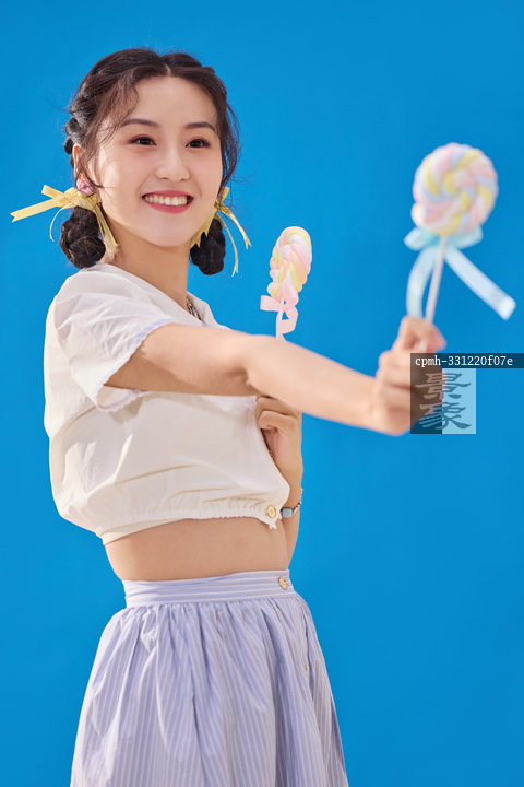 图片标题: 蓝色背景下的拿着棒棒糖的快乐女人