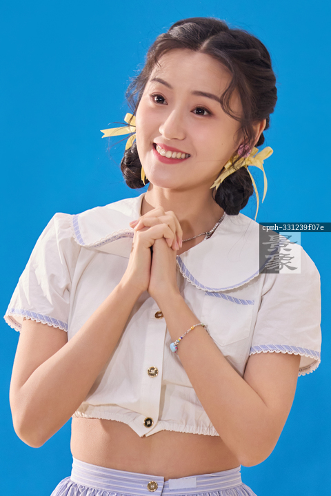 图片标题: 蓝色背景下的一位快乐的青年女人