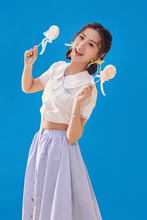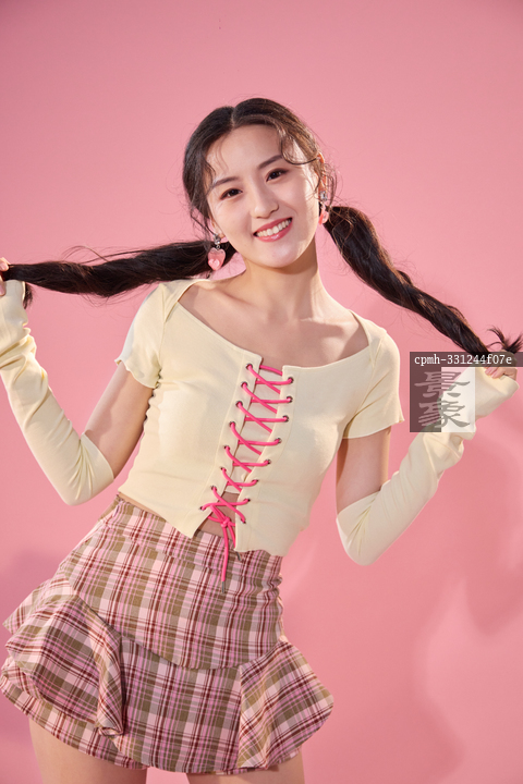 图片标题: 粉色背景下的一位年轻快乐女孩