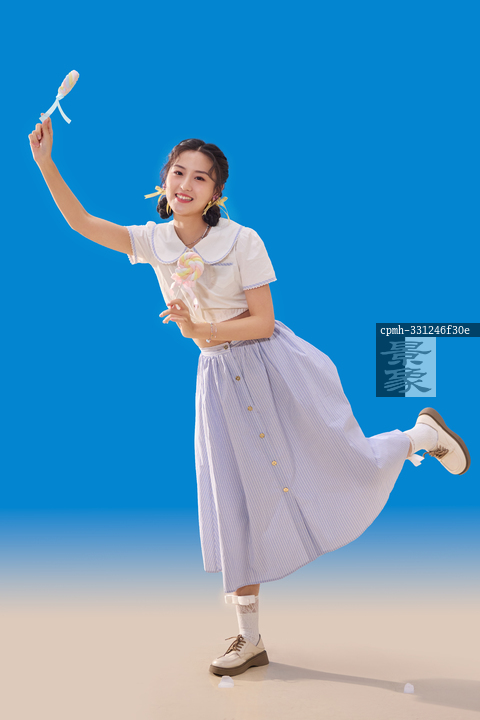 图片标题: 蓝色背景下的拿着棒棒糖的快乐女人