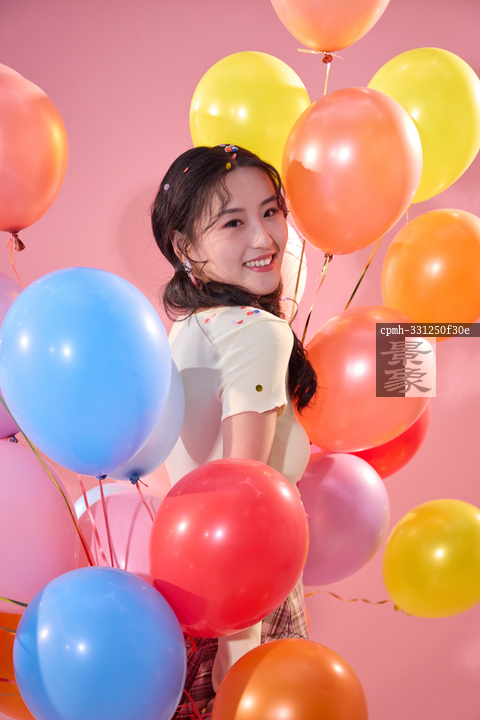 图片标题: 一位充满活力的年轻女孩拿着大量气球