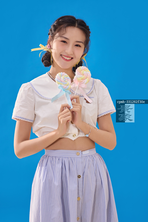 图片标题: 蓝色背景下的拿着棒棒糖的快乐女人
