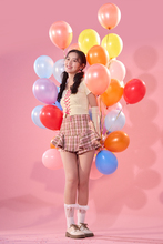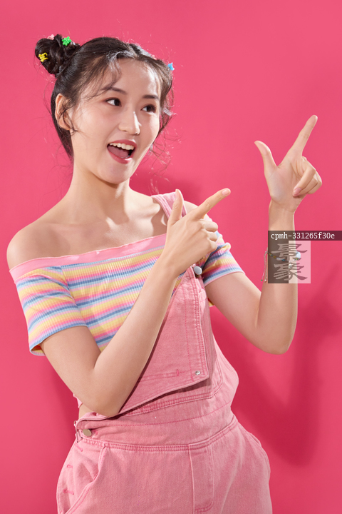 图片标题: 粉色背景下穿背带裤的快乐女孩