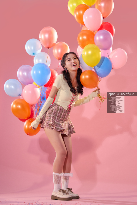 图片标题: 一位充满活力的年轻女孩拿着大量气球