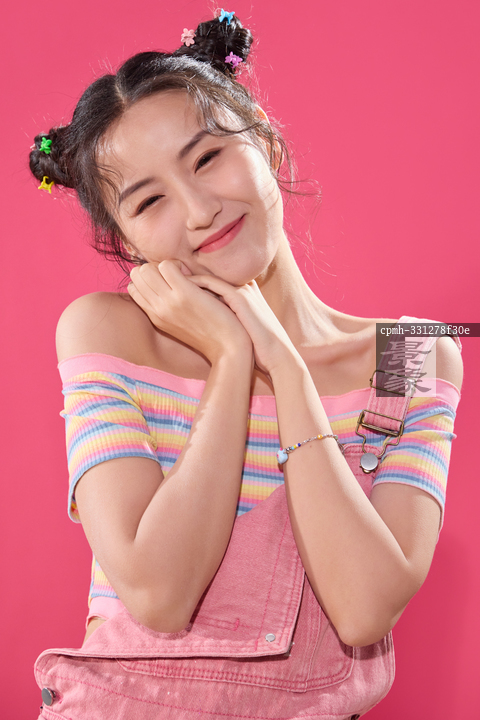 图片标题: 粉色背景下穿背带裤的快乐女孩