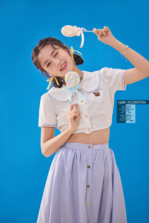 图片标题: 蓝色背景下的拿着棒棒糖的快乐女人