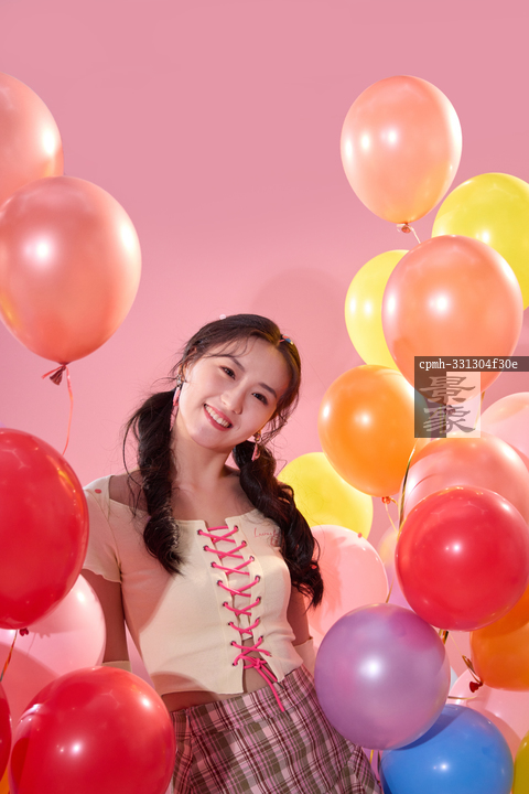 图片标题: 一位充满活力的年轻女孩拿着大量气球