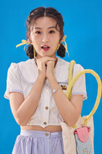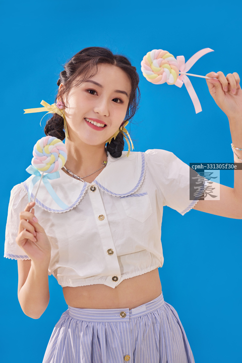 图片标题:     蓝色背景下的拿着棒棒糖的快乐女人