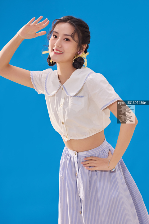 图片标题: 蓝色背景下的快乐女人