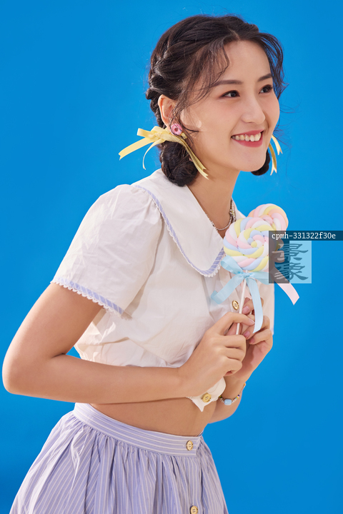 图片标题:     蓝色背景下的拿着棒棒糖的快乐女人