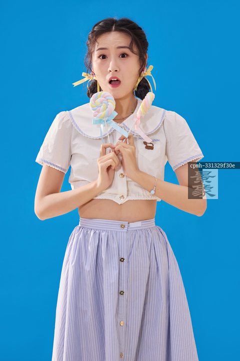 图片标题: 蓝色背景下的拿着棒棒糖的青年女人