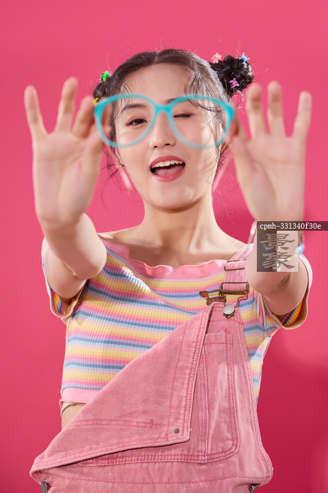 图片标题:     粉色背景下戴眼镜的快乐女孩