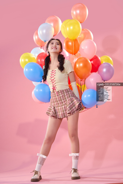 图片标题: 一位充满活力的年轻女孩拿着大量气球