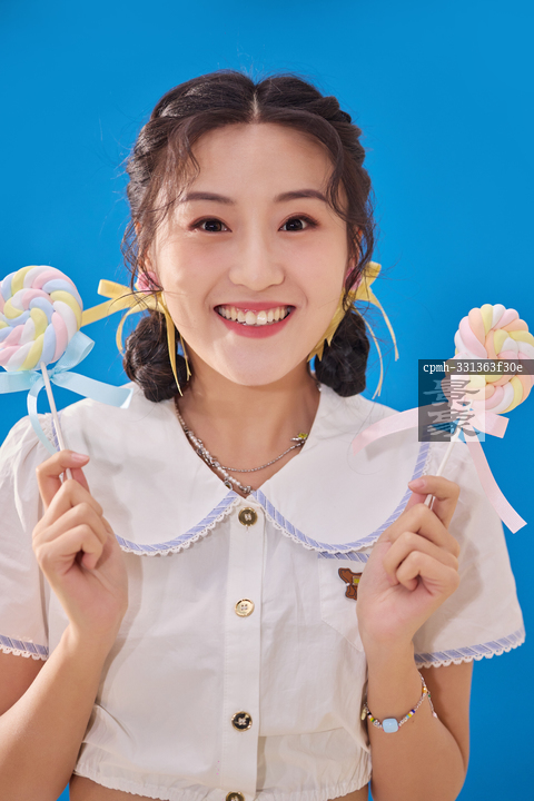 图片标题: 蓝色背景下的拿着棒棒糖的快乐女人
