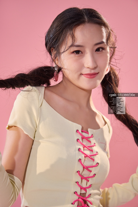 图片标题: 粉色背景下的一位年轻快乐女孩