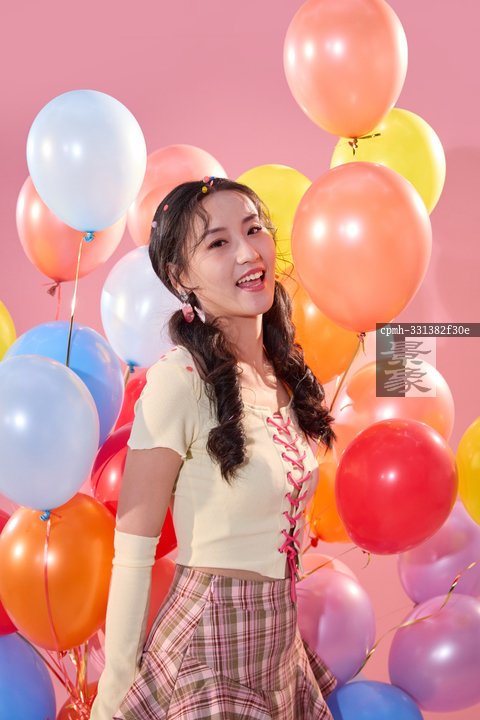 图片标题: 一位充满活力的年轻女孩拿着大量气球