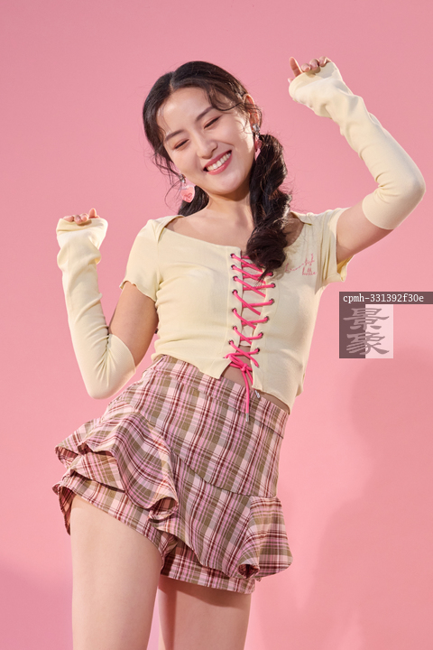 图片标题: 粉色背景下的一位年轻快乐女孩