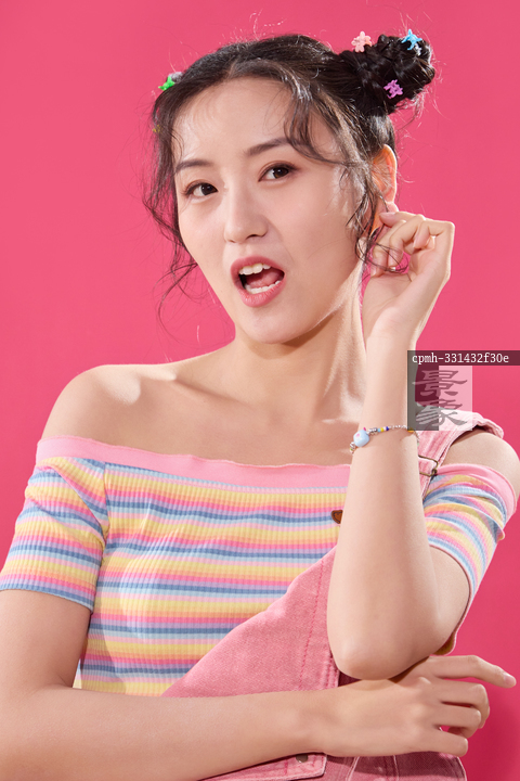 图片标题: 粉色背景下穿背带裤的快乐女孩