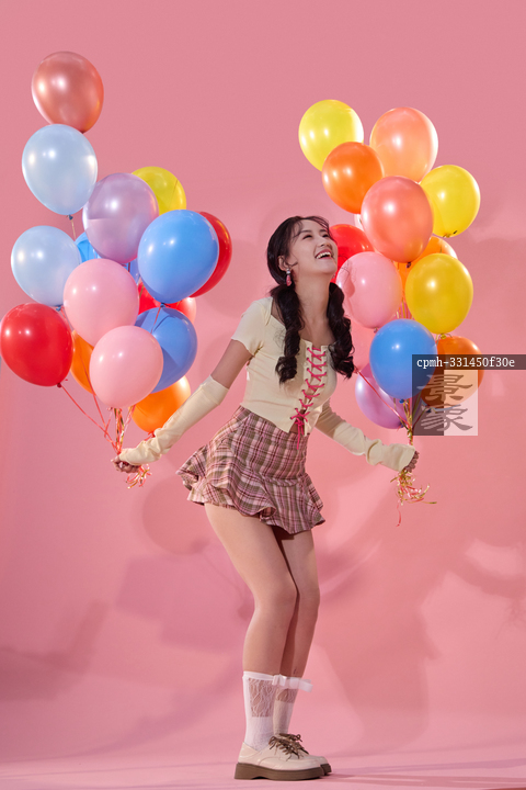 图片标题: 一位充满活力的年轻女孩拿着大量气球