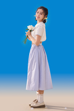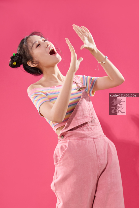图片标题: 粉色背景下穿背带裤的快乐女孩