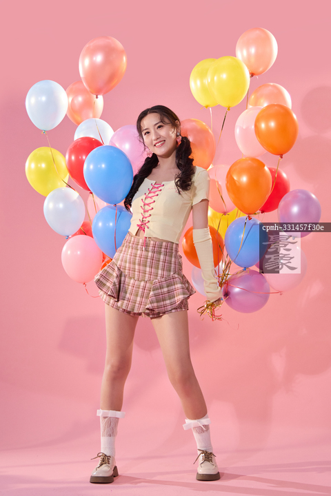图片标题:     一位充满活力的年轻女孩拿着大量气球