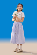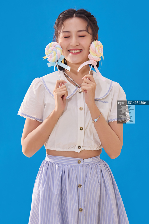 图片标题: 蓝色背景下的拿着棒棒糖的快乐女人