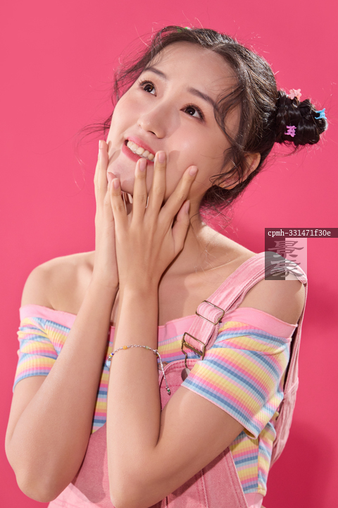 图片标题: 粉色背景下穿背带裤的快乐女孩