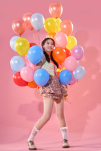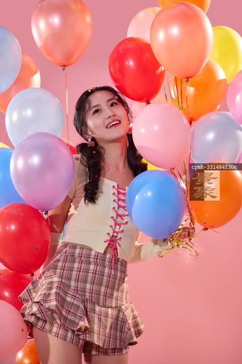 图片标题: 一位充满活力的年轻女孩拿着大量气球