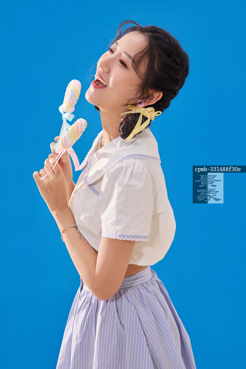图片标题:     蓝色背景下的拿着棒棒糖的快乐女人