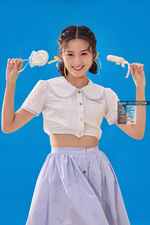 图片标题:     蓝色背景下的拿着棒棒糖的快乐女人