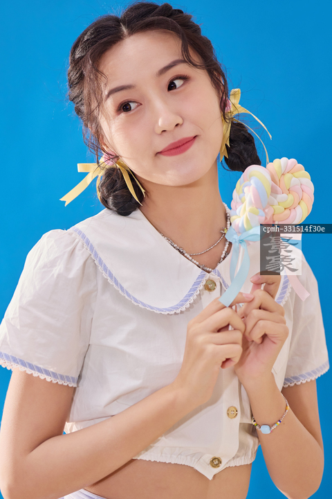 图片标题: 蓝色背景下的拿着棒棒糖的快乐女人