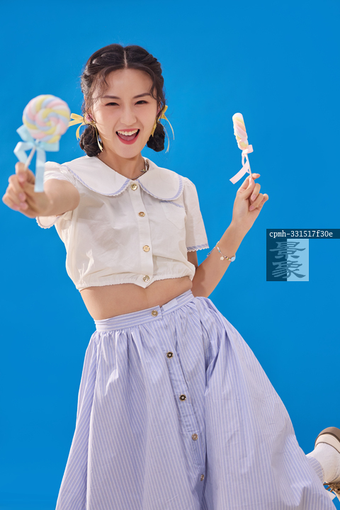 图片标题: 蓝色背景下的拿着棒棒糖的快乐女人