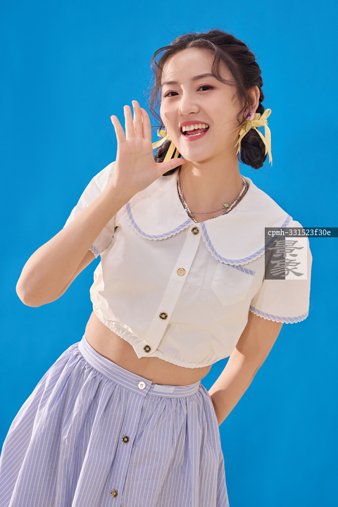 图片标题: 蓝色背景下的快乐女人