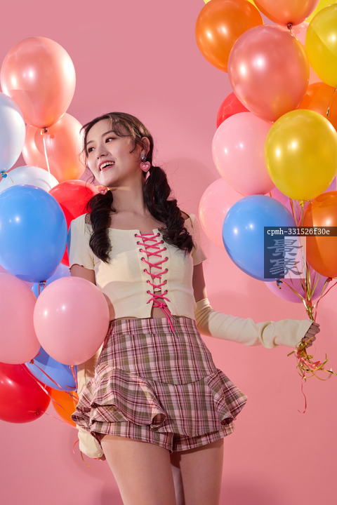 图片标题: 一位充满活力的年轻女孩拿着大量气球