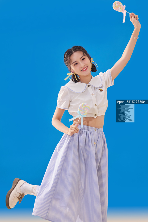 图片标题:     蓝色背景下的拿着棒棒糖的快乐女人