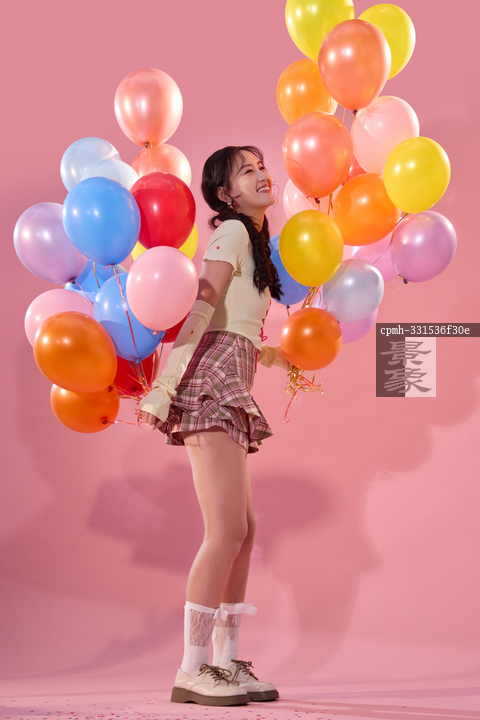 图片标题:     一位充满活力的年轻女孩拿着大量气球