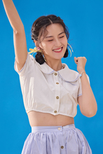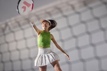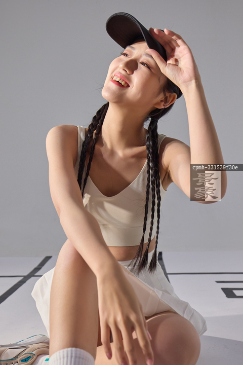 图片标题: 一位做运动的青年女人坐在地板上休息