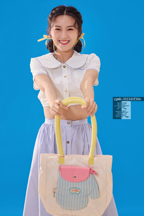 图片标题: 蓝色背景下的快乐女人