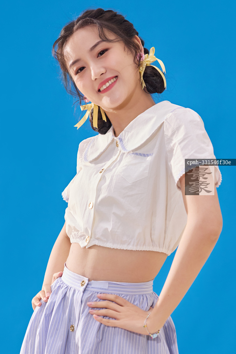 图片标题: 蓝色背景下的快乐女人