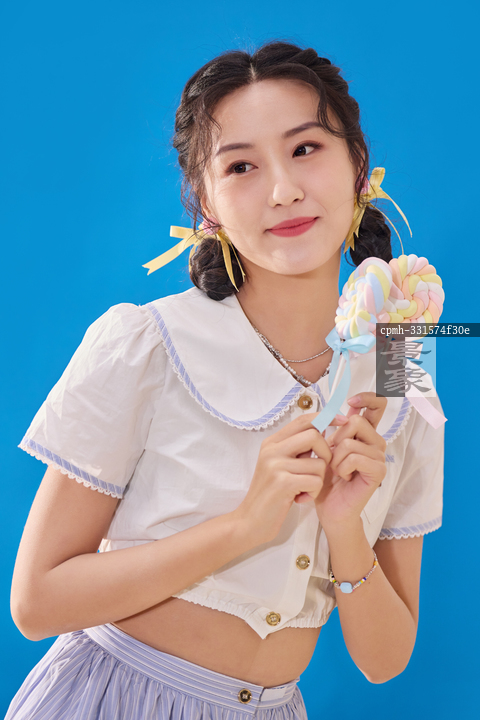 图片标题: 蓝色背景下的拿着棒棒糖的快乐女人