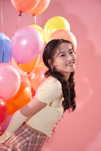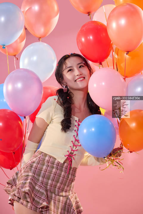 图片标题: 一位充满活力的年轻女孩拿着大量气球