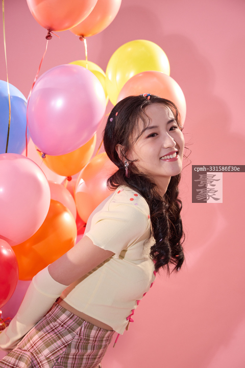 图片标题: 一位充满活力的年轻女孩拿着大量气球