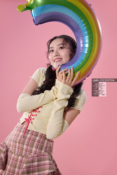 图片标题: 粉色背景下的一位年轻快乐女孩