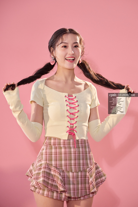 图片标题:     粉色背景下的一位年轻快乐女孩