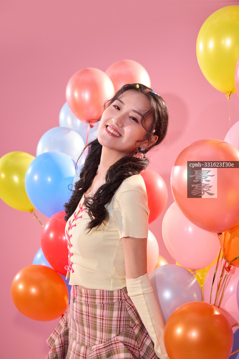 图片标题: 一位充满活力的年轻女孩拿着大量气球