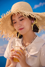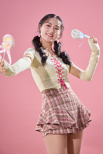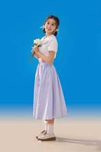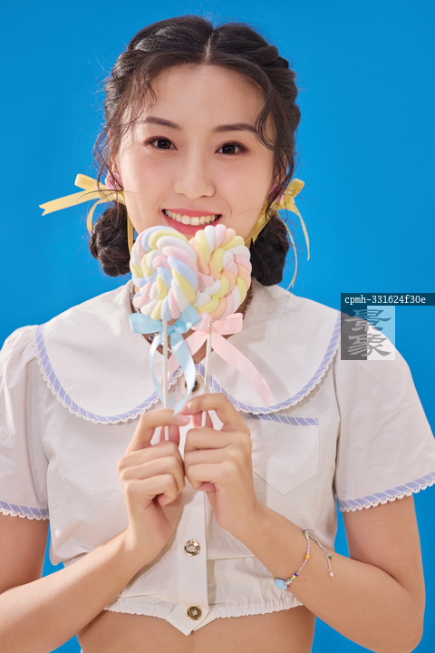 图片标题: 蓝色背景下的拿着棒棒糖的快乐女人